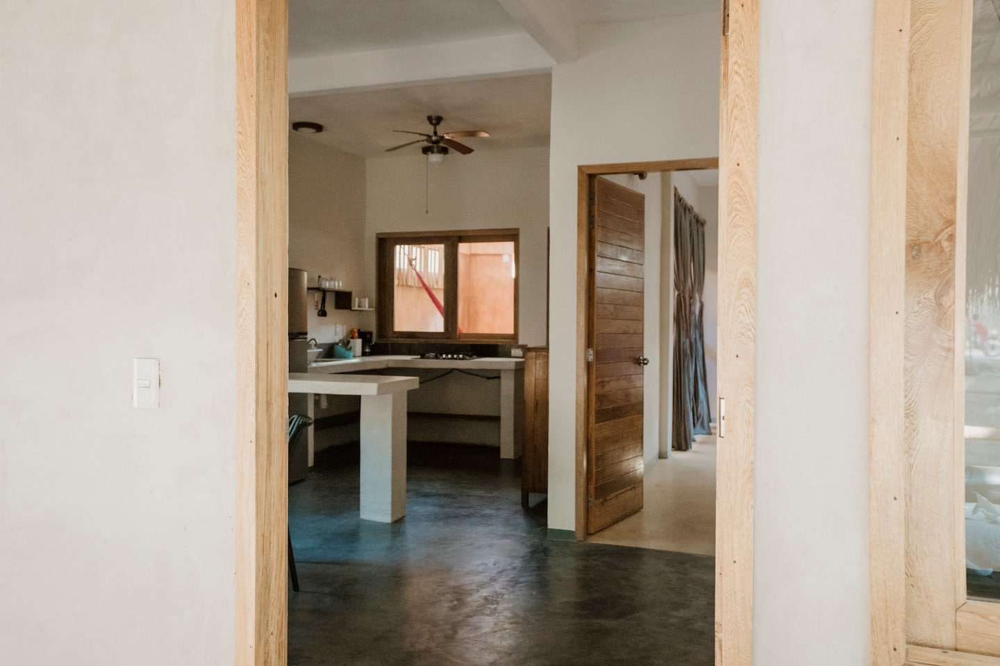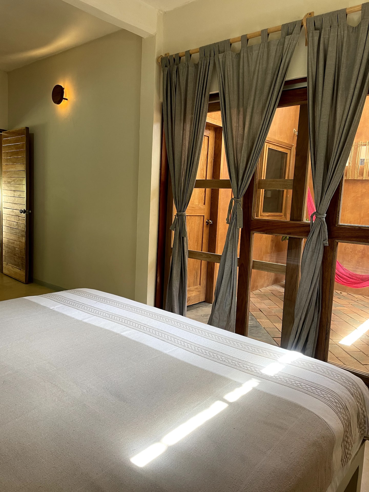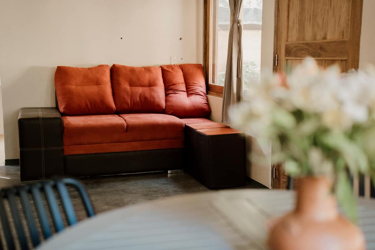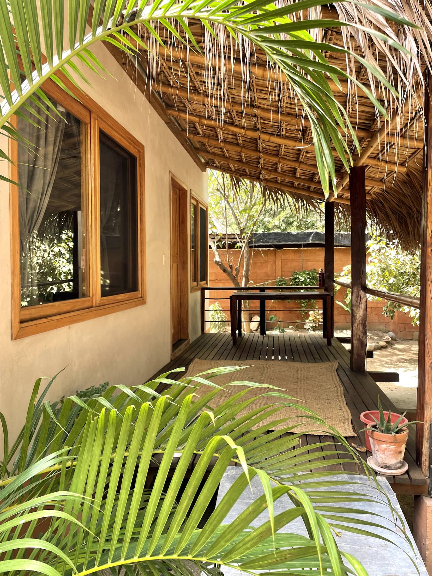 This comfortable and spacious apartment has a king-size bed and a Queen size bed, both in the same room. It also has a living room, kitchen, and an interior patio. Just a few minutes’ walk from the beach, half an hour away from the Flying Flow space.