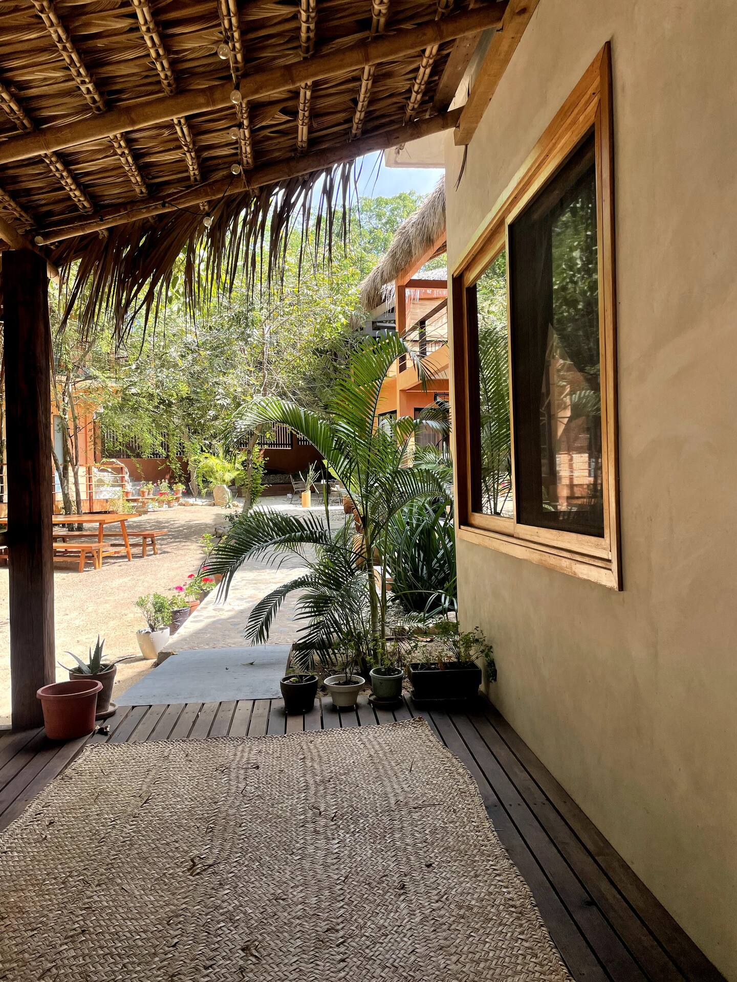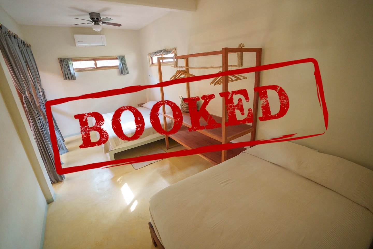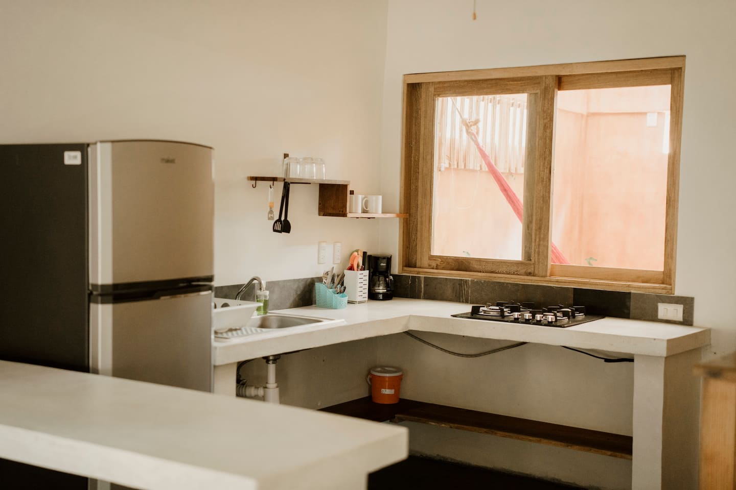 This comfortable and spacious apartment has a king-size bed and a Queen size bed, both in the same room. It also has a living room, kitchen, and an interior patio. Just a few minutes’ walk from the beach, half an hour away from the Flying Flow space.